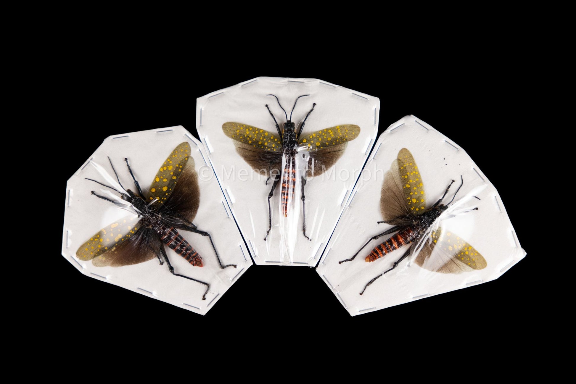 Aularches Punctatus, commonly known as the Coffee Locust or Northern Painted Grasshopper. This extraordinary species is instantly recognizable for its bold red and black body contrasted with green-brown wings patterned with vivid yellow spots, making it one of the most eye-catching grasshoppers in the world.