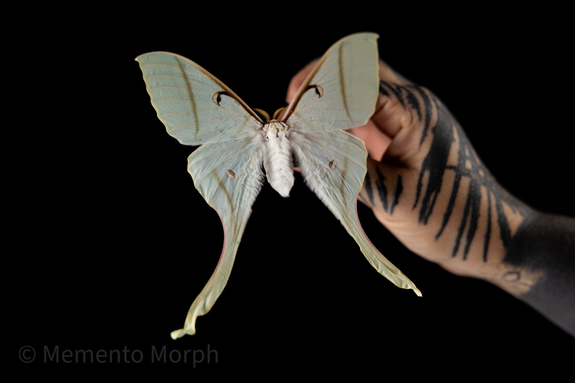 Actias Rhodopneuma (Female), an exquisite silk moth admired for its pastel tones of pale green wings and elegantly curved tails. Native to southern China and Southeast Asia, this species radiates delicate beauty, representing one of the most striking members of the Saturniidae family.