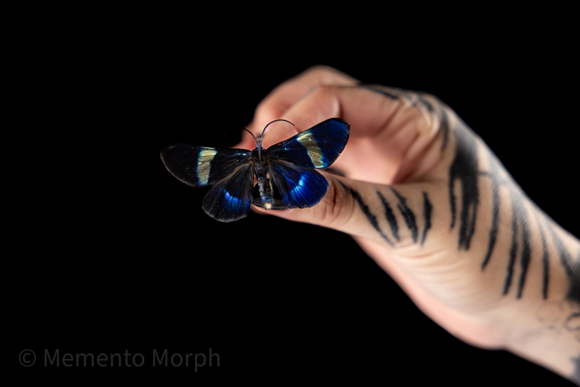 Milionia Delicatula, a stunning day-flying moth admired for its vivid contrast of deep black wings accented with brilliant blue and yellow bands. Native to Indonesia, this rare specimen showcases the dazzling beauty and variety found within the Geometridae family.
