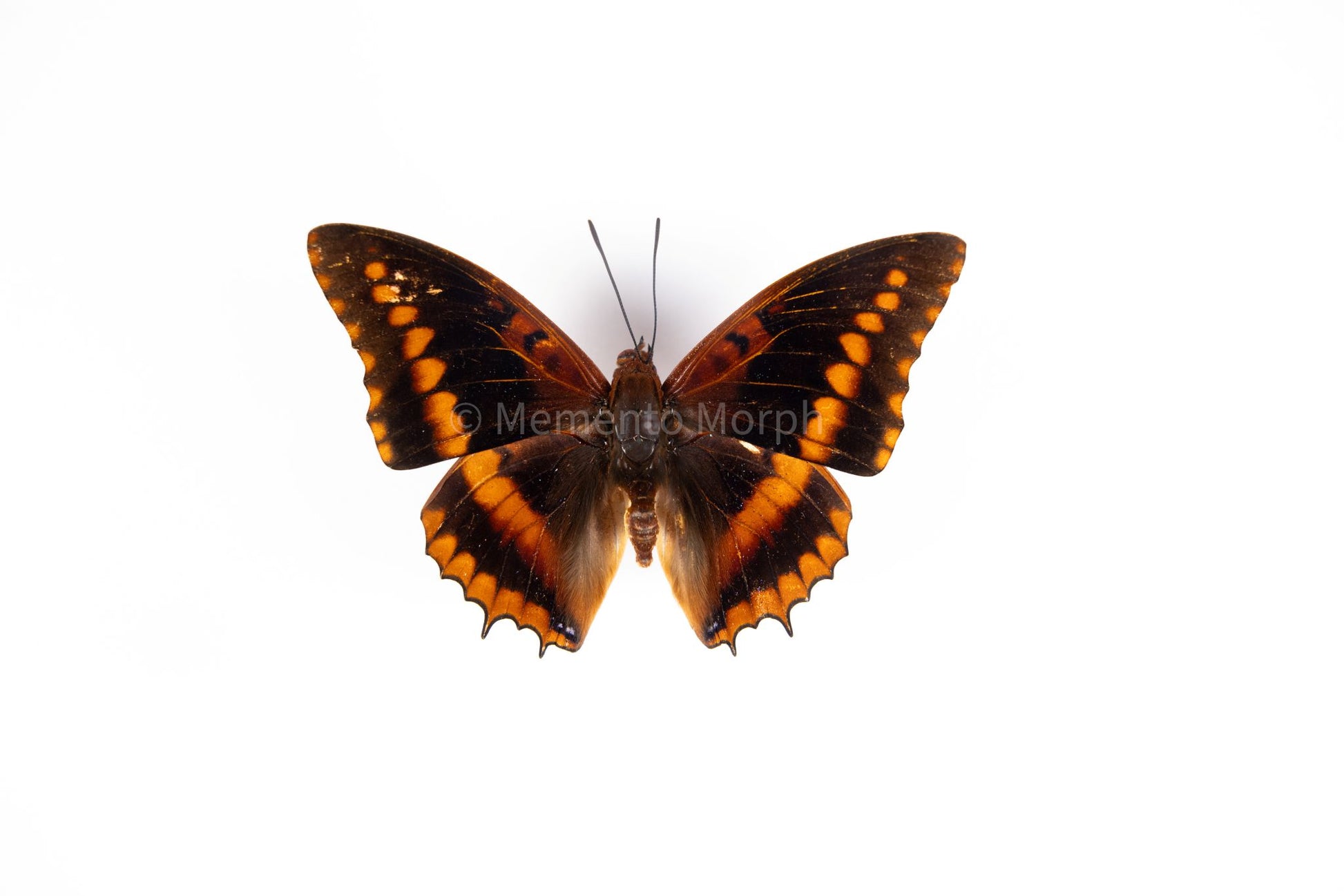 Charaxes lucretius, a butterfly admired for its deep orange-red wings contrasted with bold black borders and markings. Known for its regal appearance and strong flight, this species is a stunning example of the “rajah” or “emperor” butterflies.