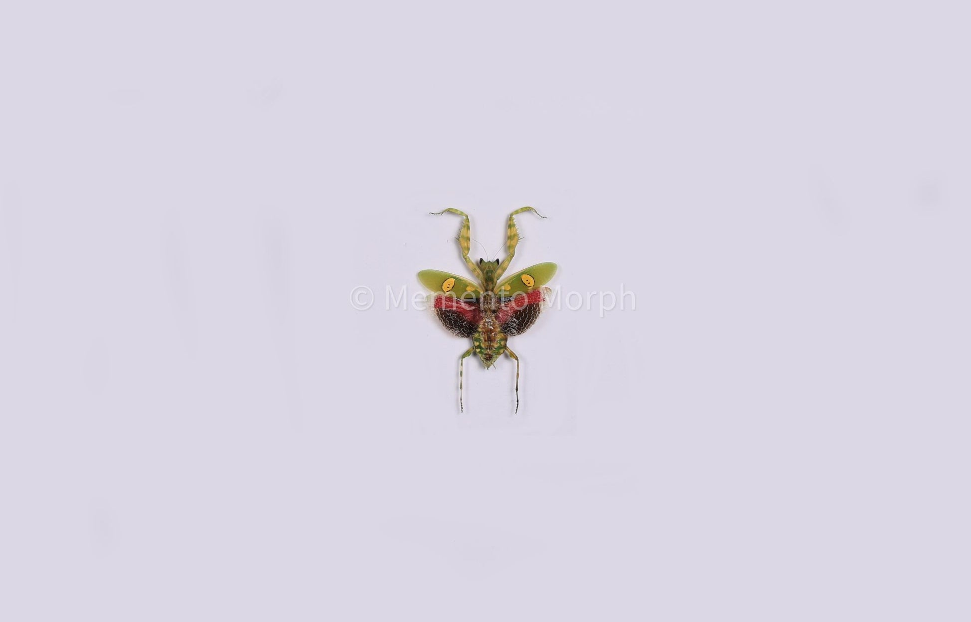 Creobroter Gemmatus, commonly known as the Jeweled Flower Mantis. Famous for its vibrant leaf-like appearance and colorful display patterns, this mantis is admired for both its camouflage and its striking threat posture, where it flashes bold eye spots on its wings.