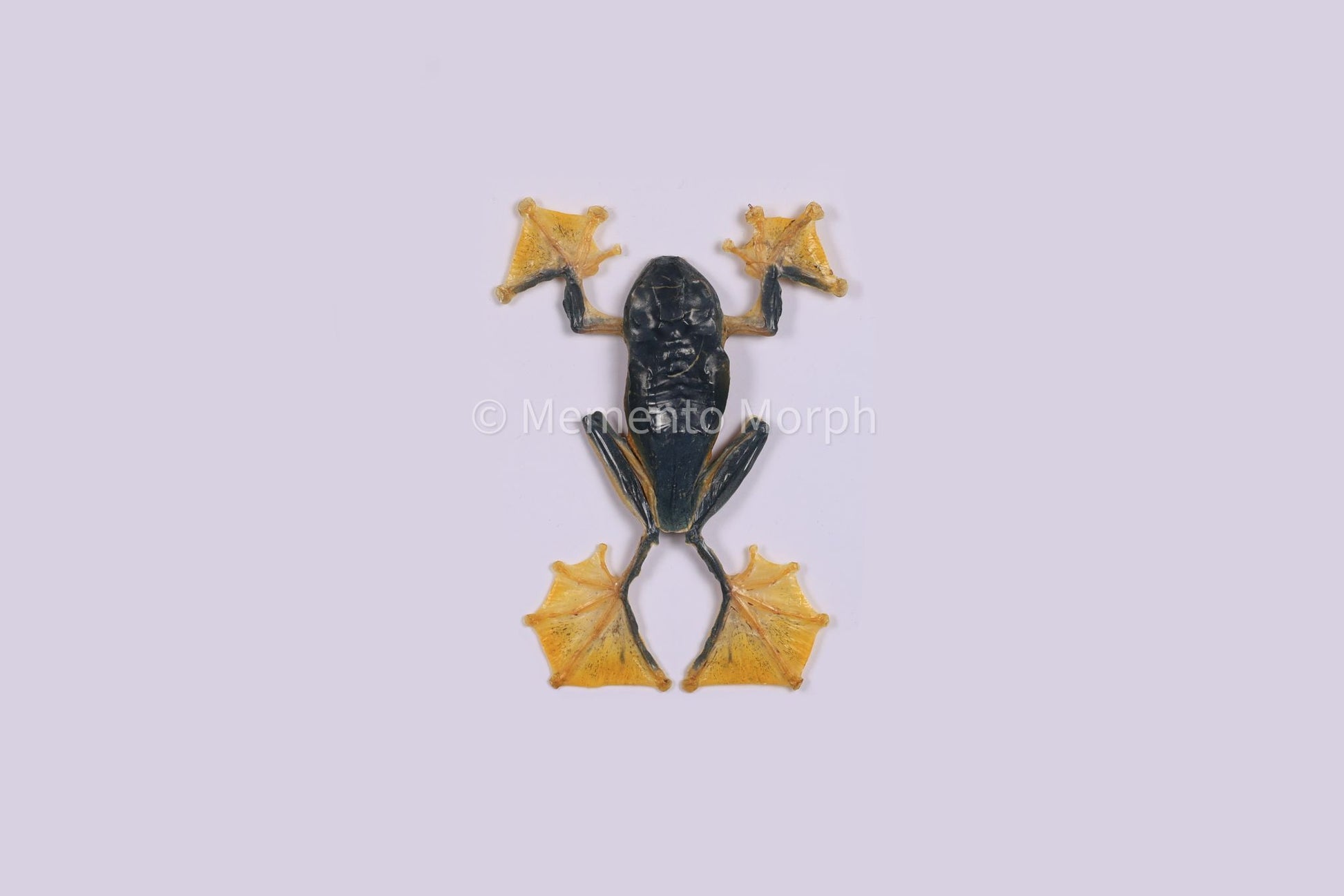 Rhacophorus Reinwardtii, commonly known as the Reinwardt’s Flying Frog. Expertly preserved, this specimen showcases the vibrant coloration, delicate limbs, and unique anatomy of this remarkable gliding amphibian.