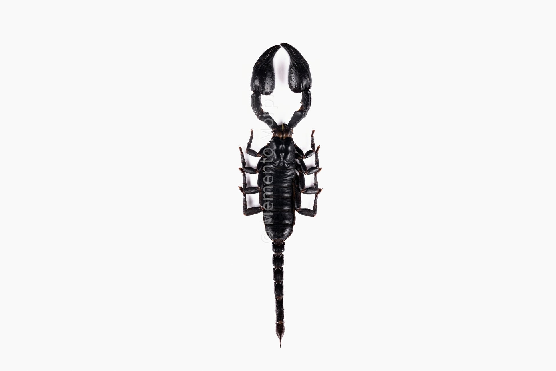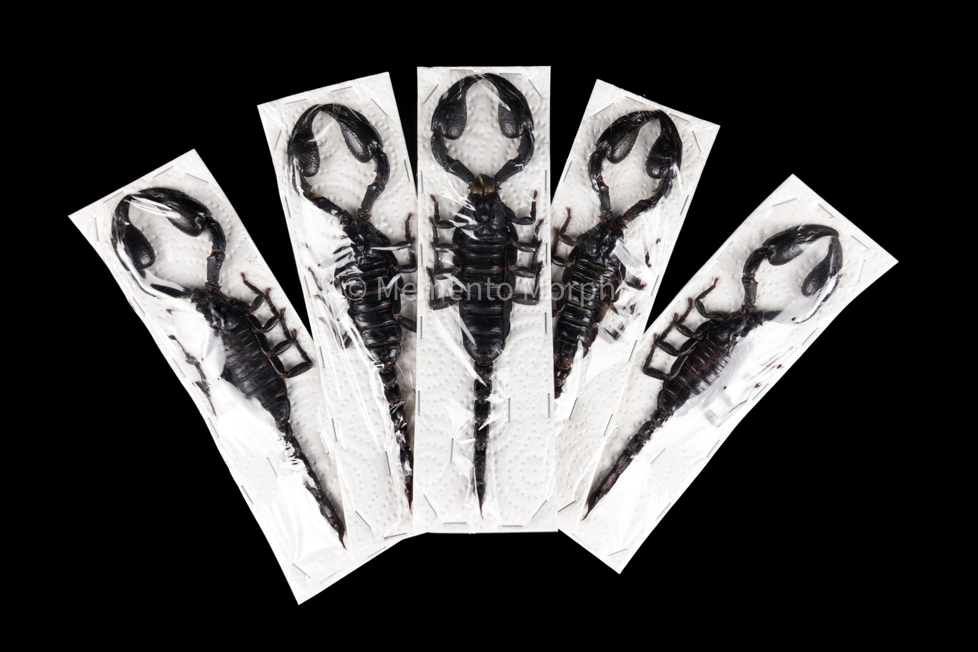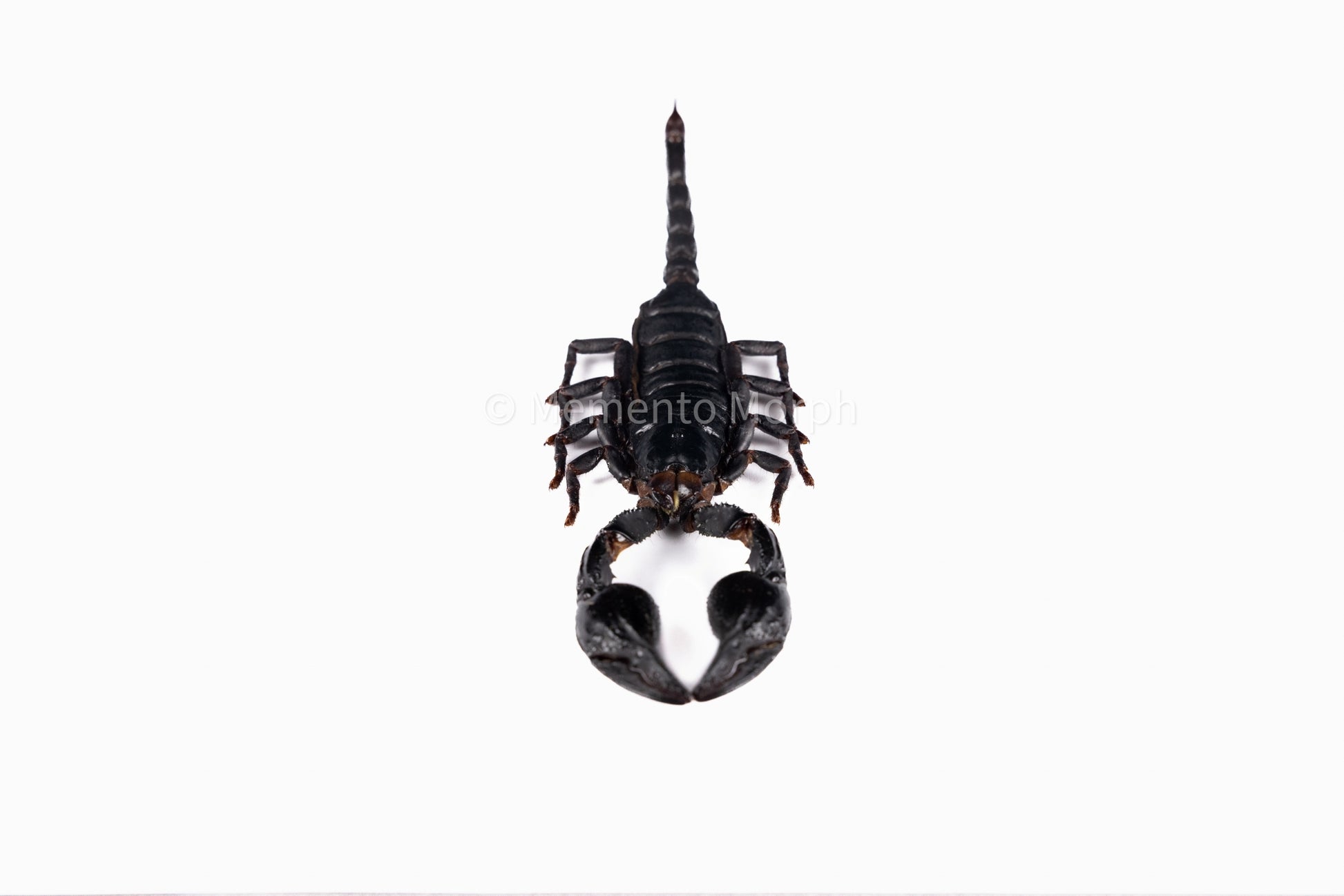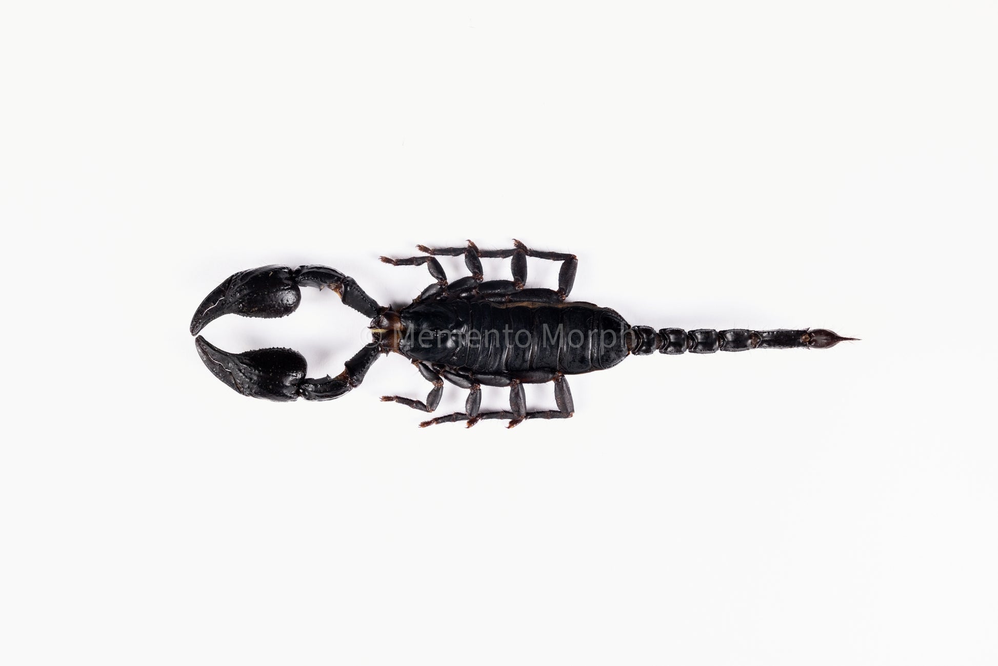 Heterometrus Laoticus, commonly known as the Asian Forest Scorpion. This large and powerful scorpion is admired for its shiny black exoskeleton, thick pincers, and commanding presence. Native to tropical forests of Southeast Asia, it is one of the largest scorpion species, making it a striking specimen for display.