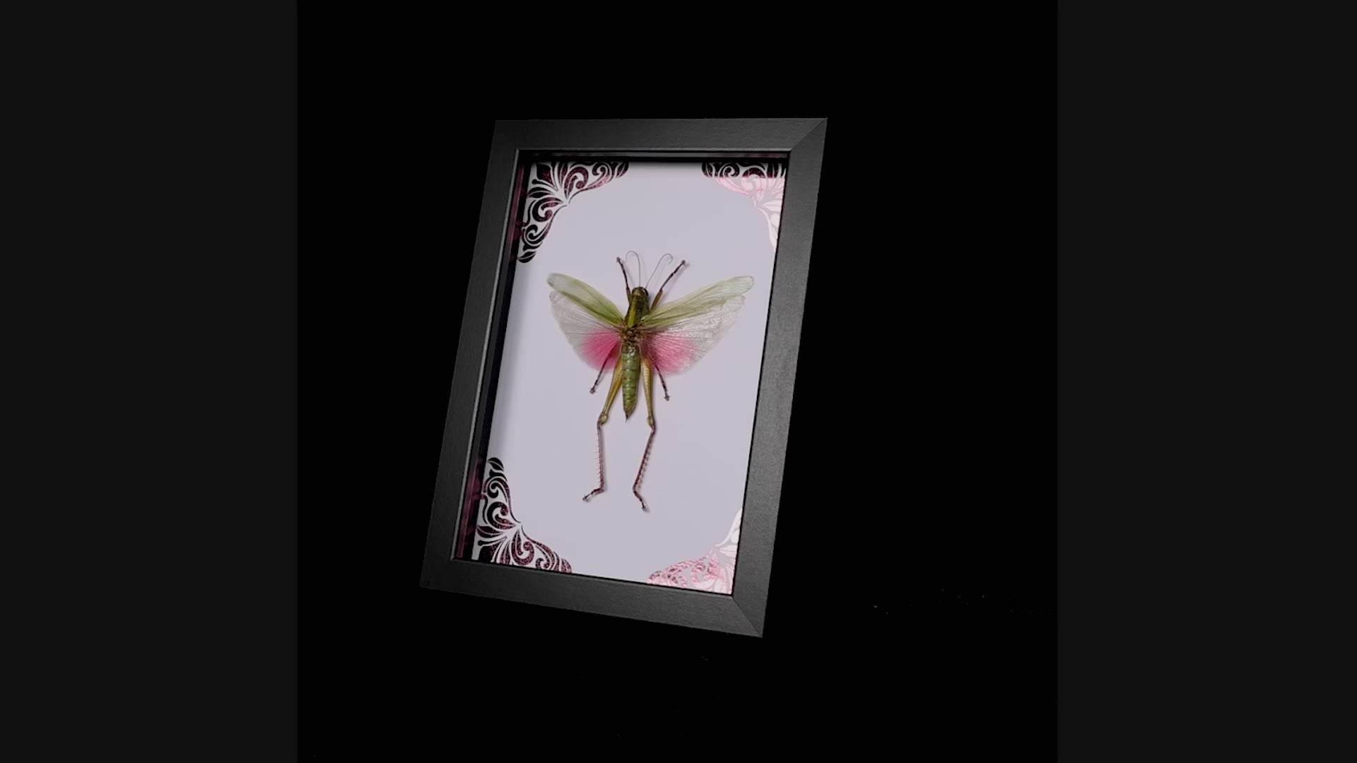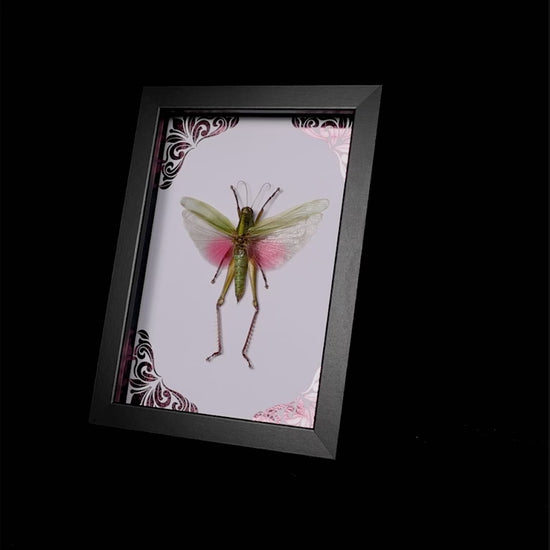 Chondracris Rosea - also known as the Giant Pink Grasshopper, mounted against a white background with pink ornaments.