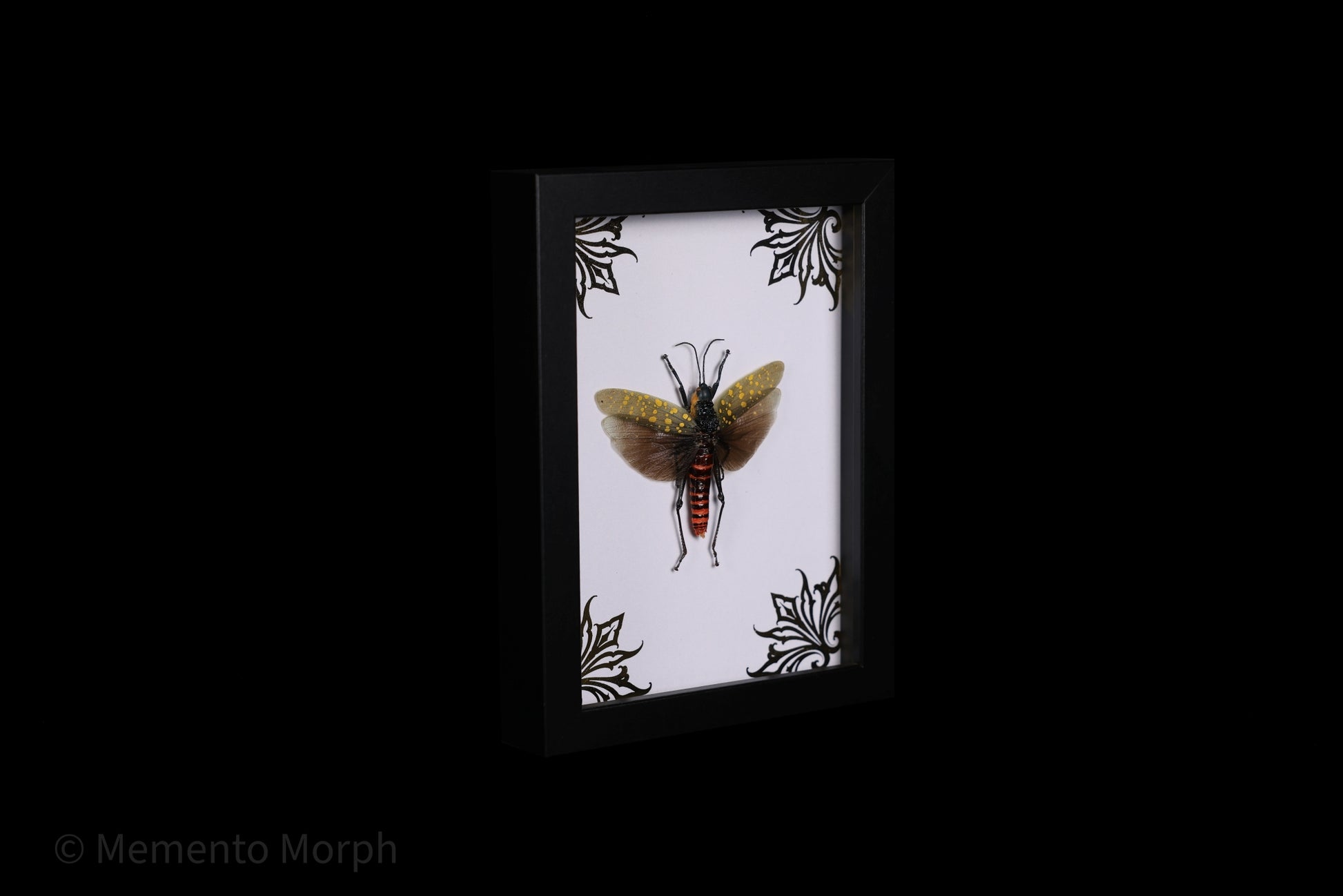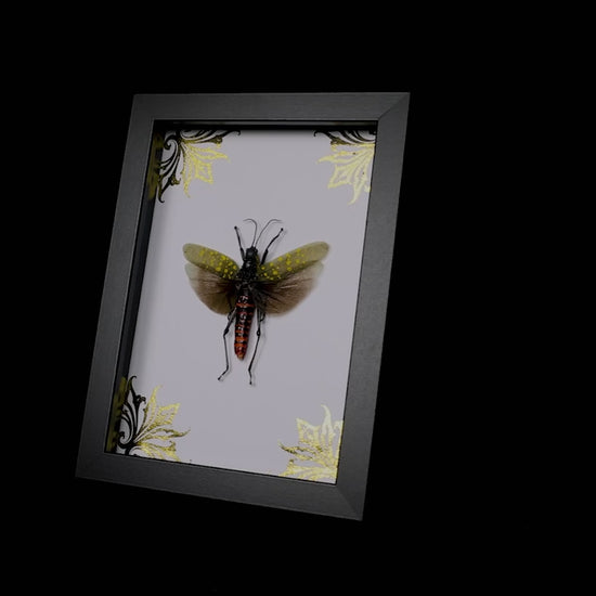 Aularches Punctatus - also known as the Coffee Locust or Foam Grasshopper, mounted against a white background with gold ornaments.