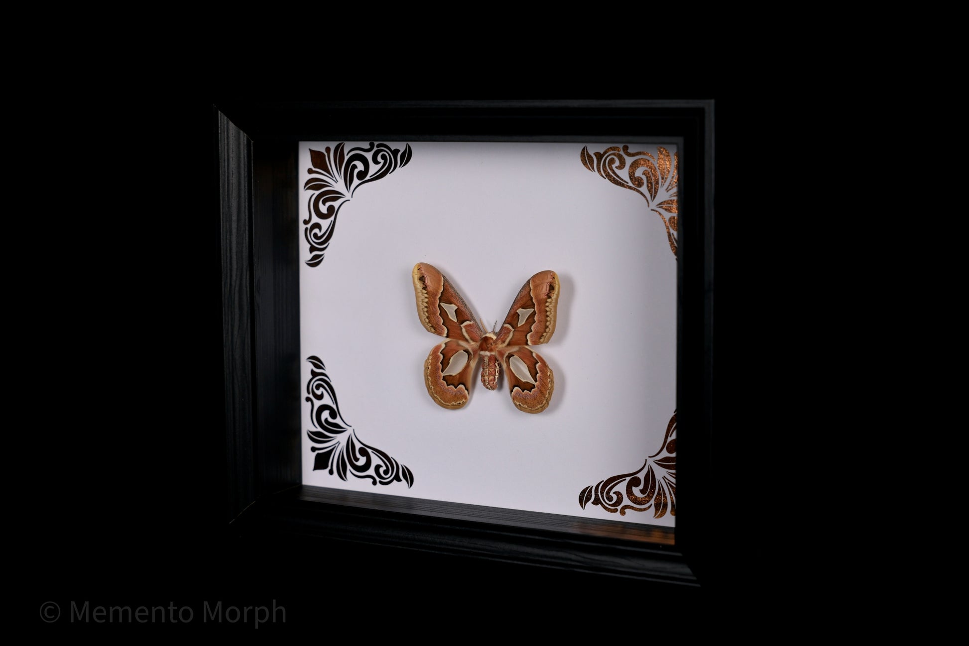 Rothschildia moth - commonly referred to as a Giant Silk-moth, mounted against a copper Ornament Background.