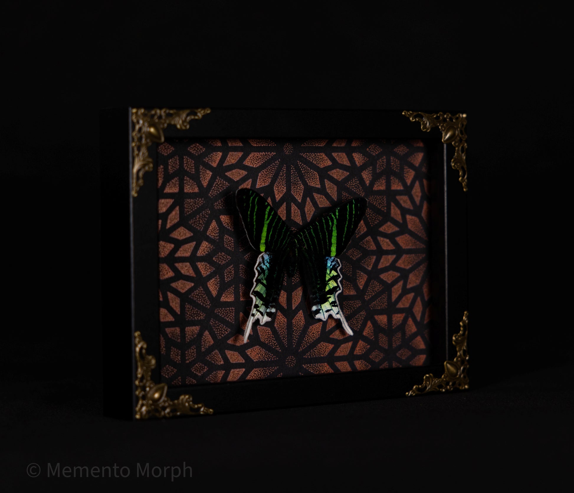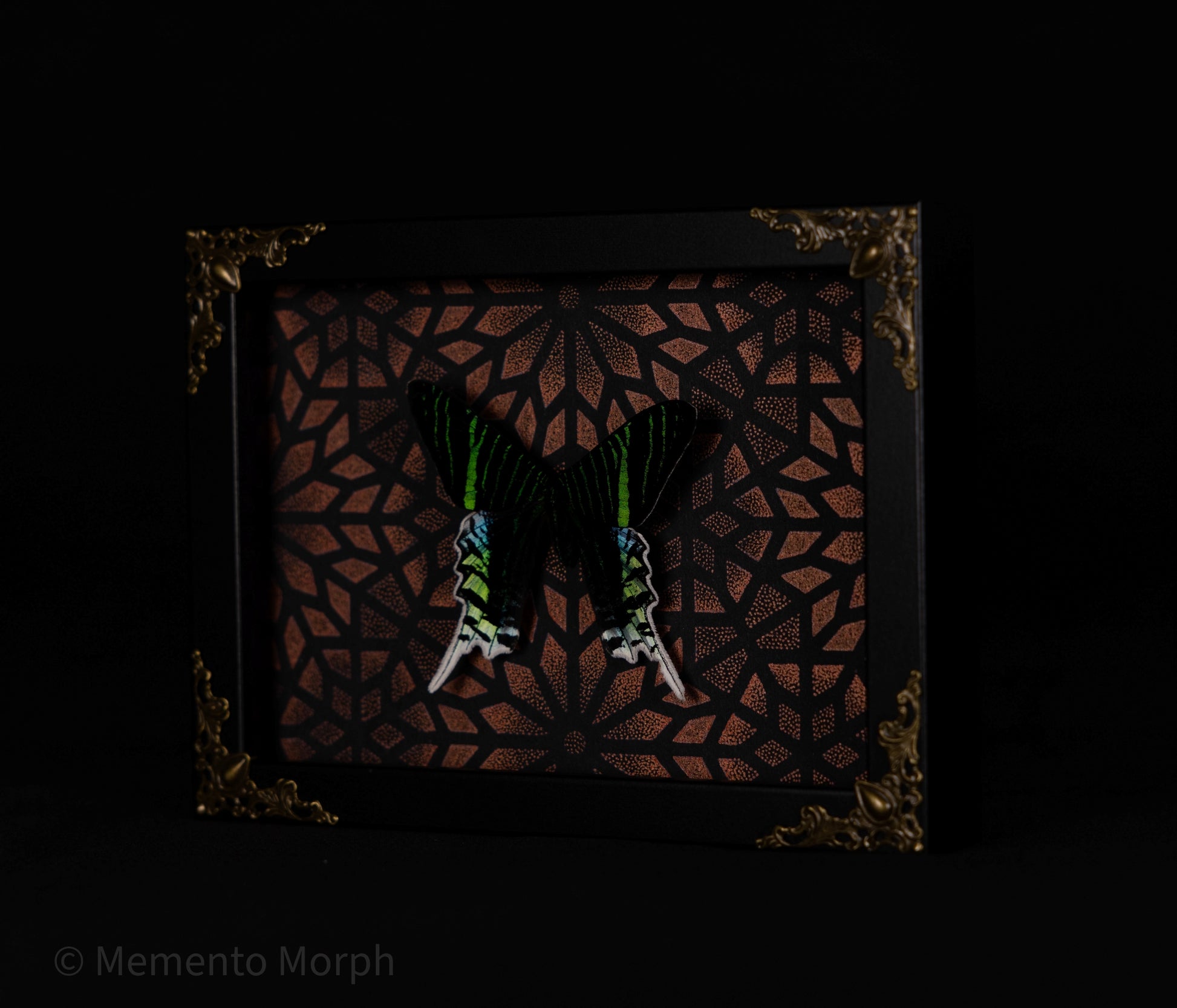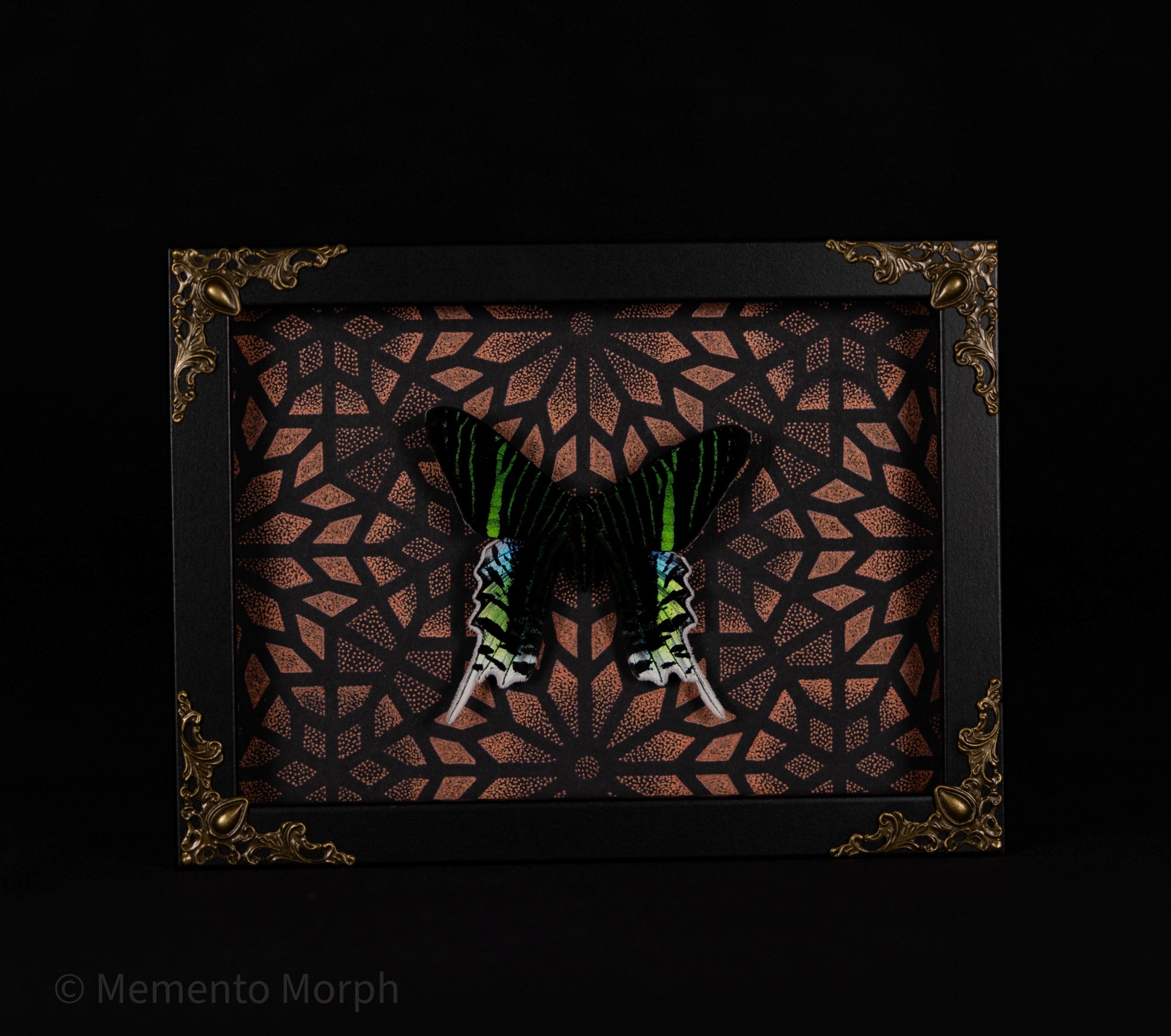 Urania Leilus Moth—also known as the Green-banded Urania—mounted against a copper pattern background. It’s hand-illustrated using meticulous dot-work technique.