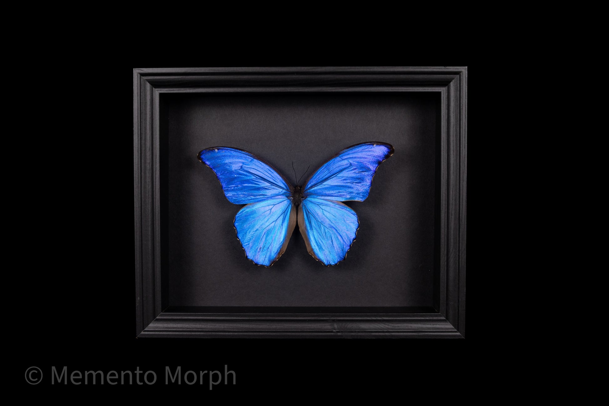 Morpho Didius - also known as the Giant Blue Morpho, mounted against a black background.