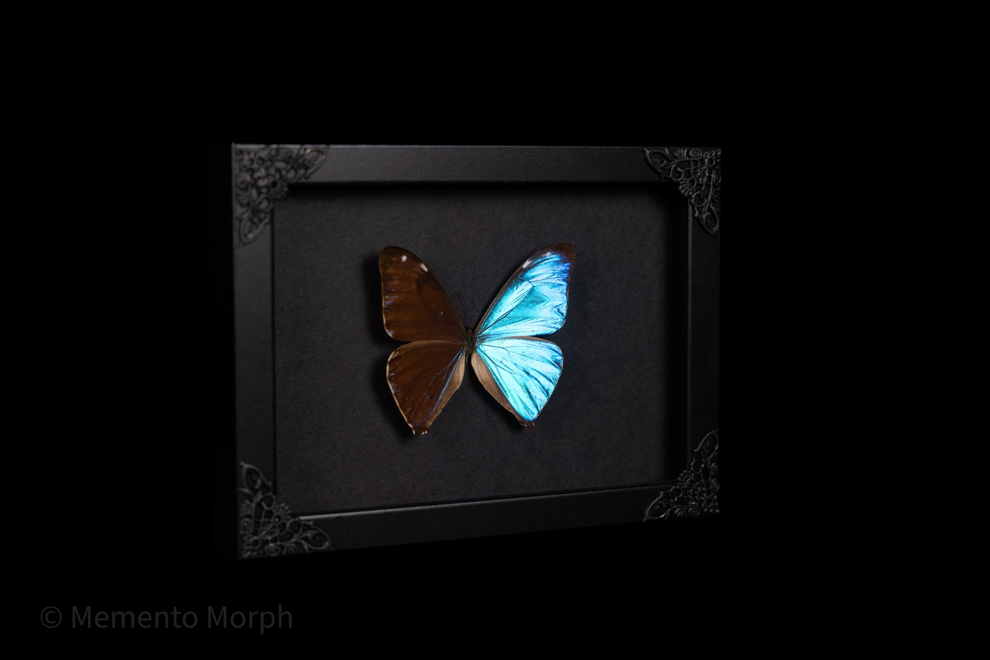 Morpho Aega - also known as the Aega Morpho, mounted against a black background.