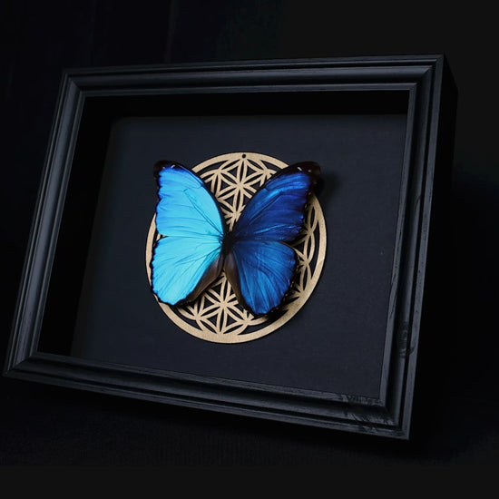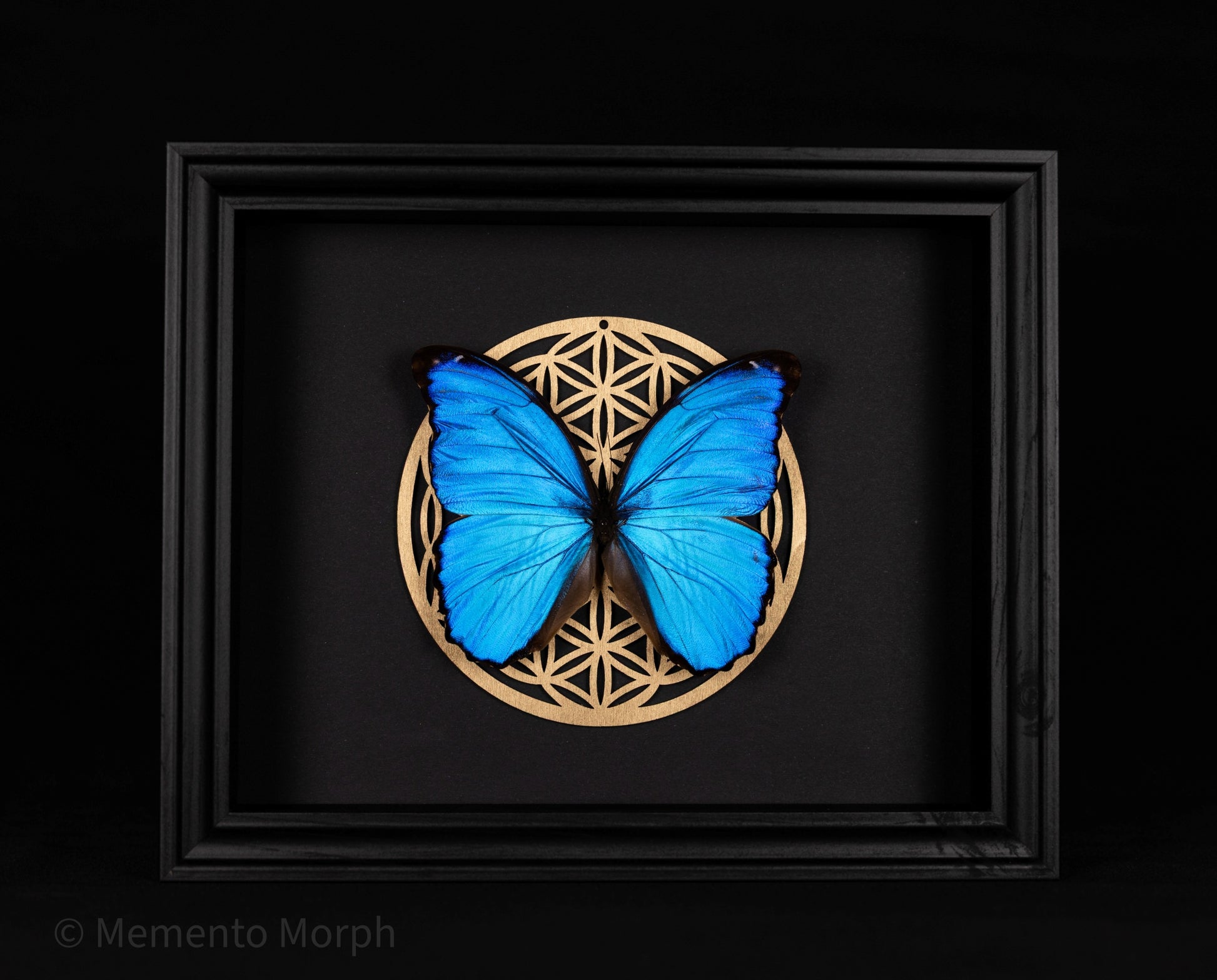 Framed Morpho Didius with Gold Flower of Life 3D Symbol