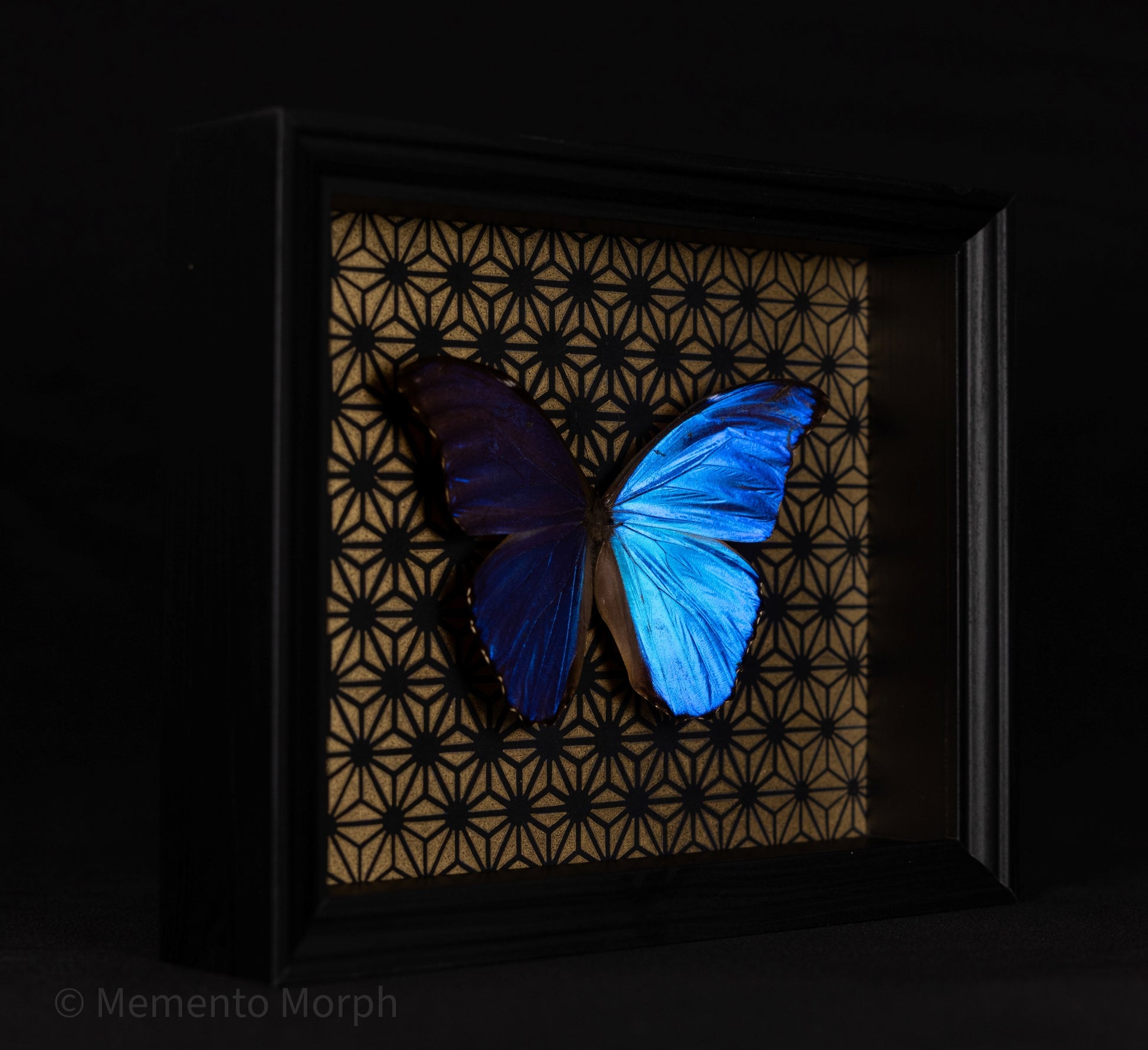 Morpho Didius - also known as the Giant Blue Morpho, mounted against a gold pattern background. It’s hand-illustrated using meticulous dot-work technique.