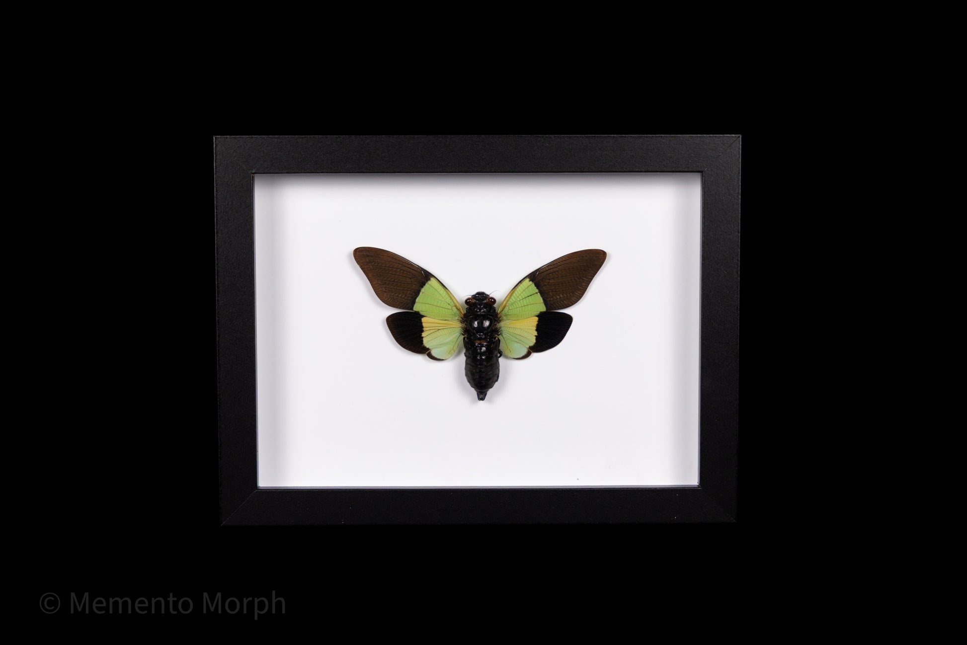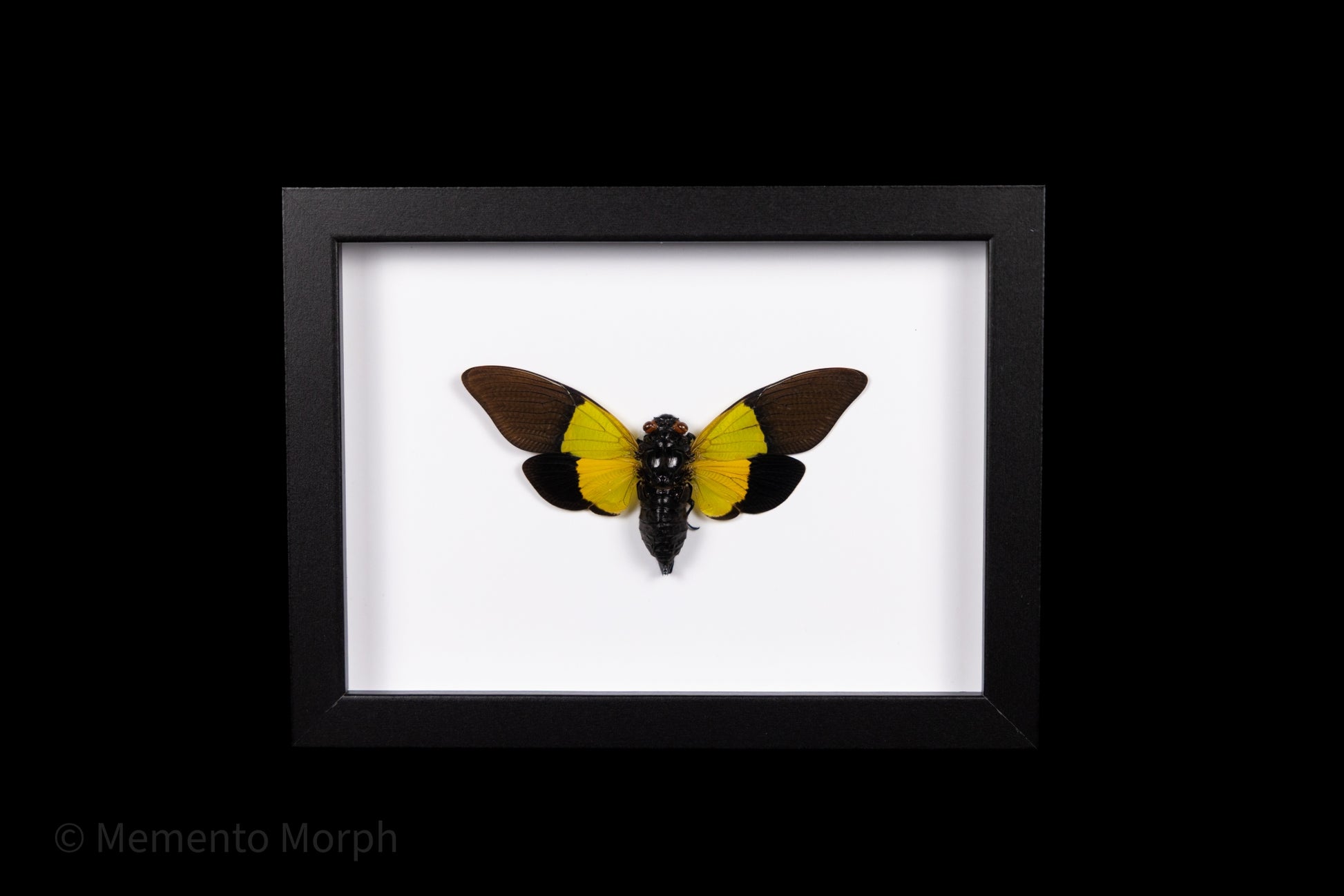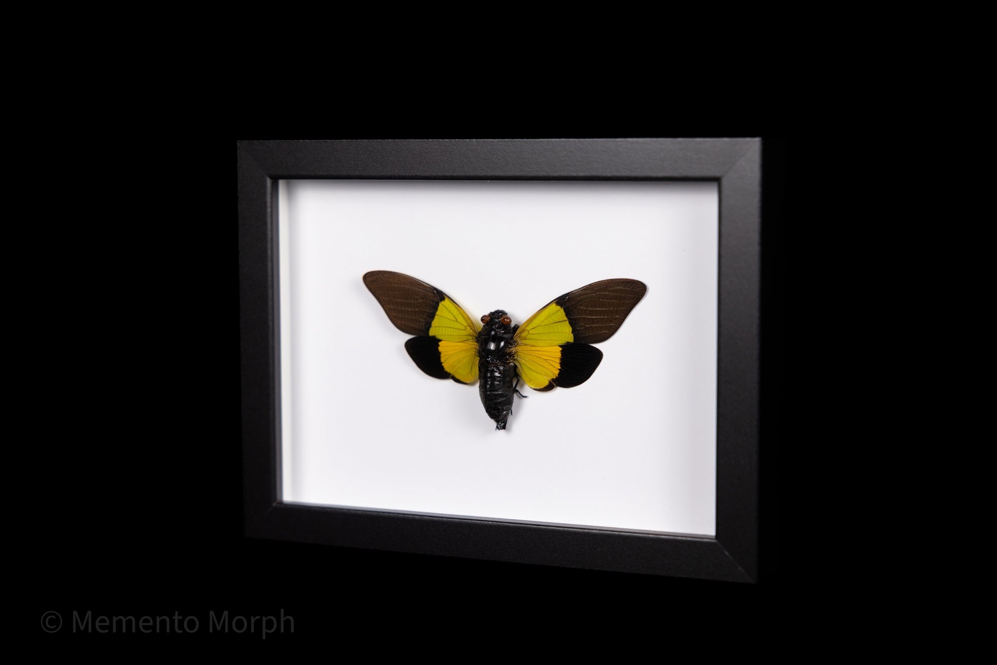 Trengganua Sibylla - also known as the Yellow-marked Cicada, mounted against a white Background.