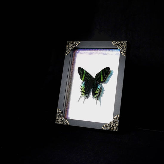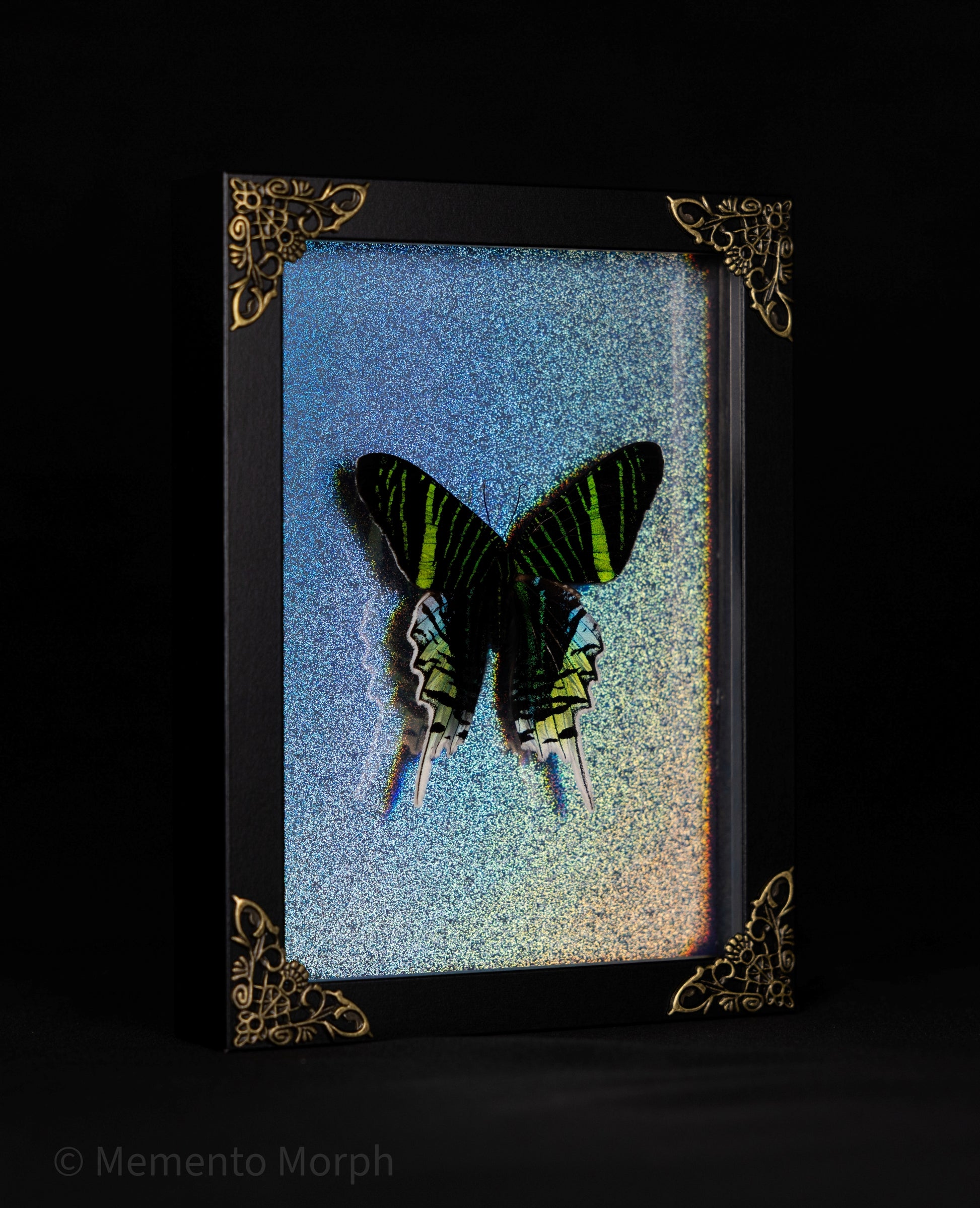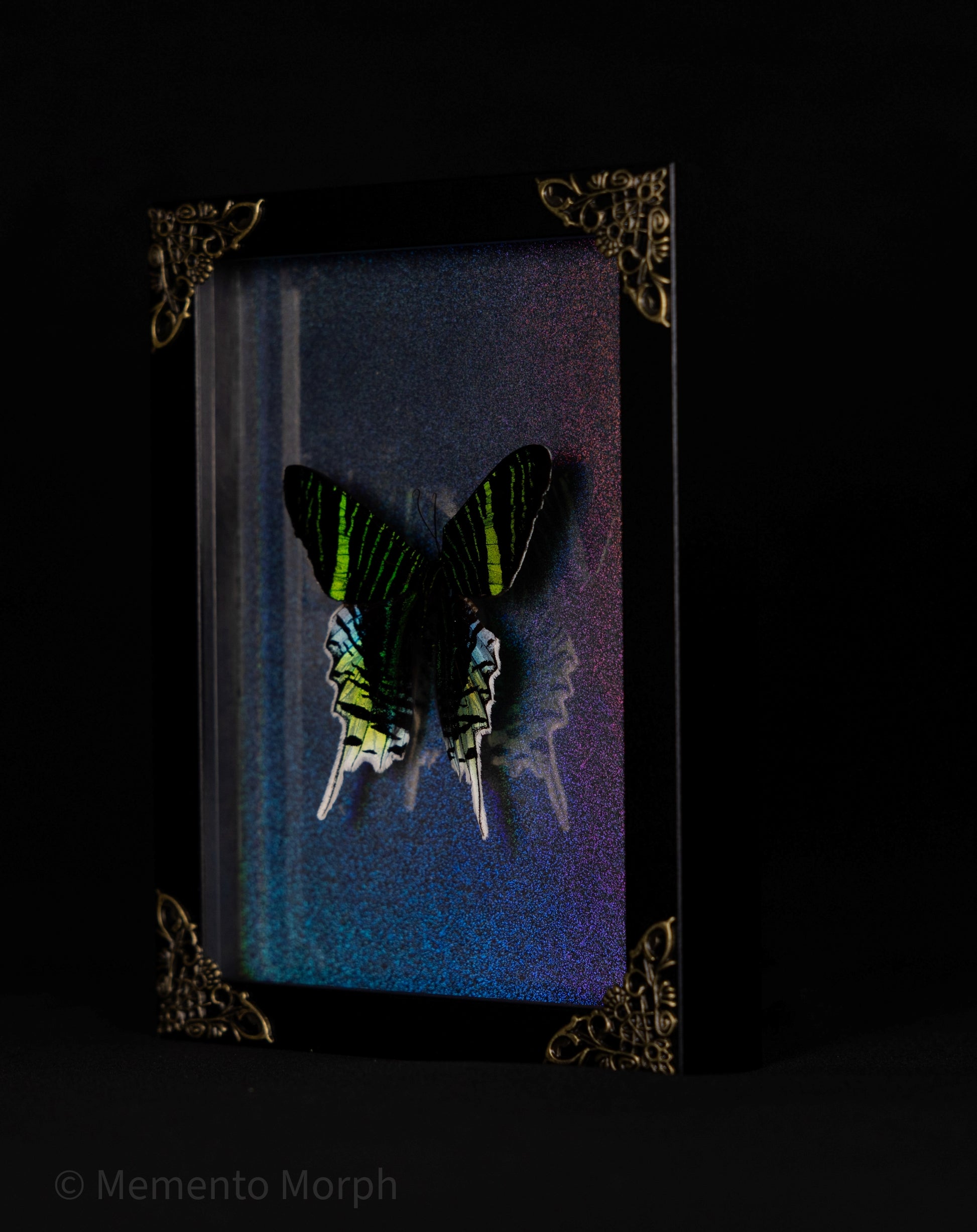 Urania Leilus Moth - also known as the Green-banded Urania, mounted against a holographic background.