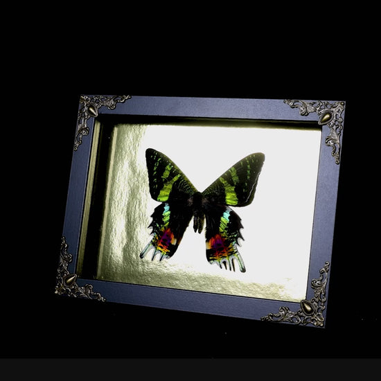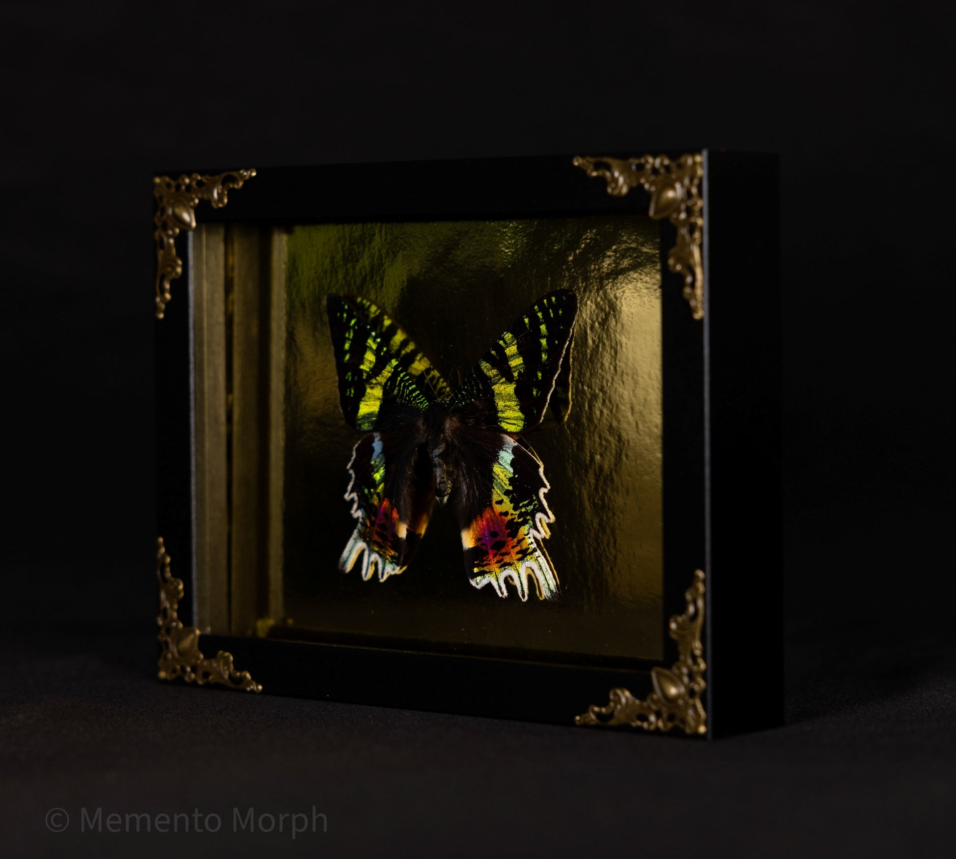 Urania Ripheus moth - also known as the Sunset Moth, mounted against a gold reflective background.