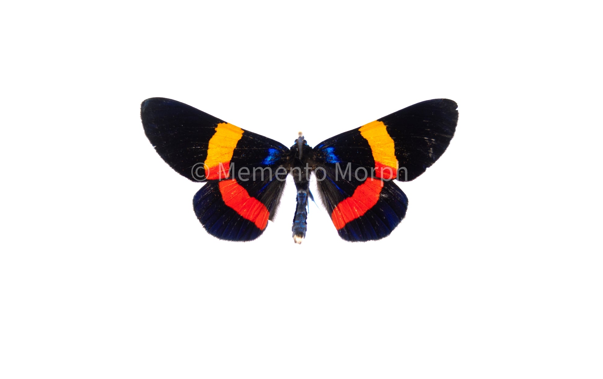 Milionia Drucei, a mesmerizing day-flying moth known for its sleek black wings adorned with vivid blue and orange markings. Native to Indonesia, this species captivates with its iridescent contrast and refined geometric patterning, a striking representative of the Geometridae family.