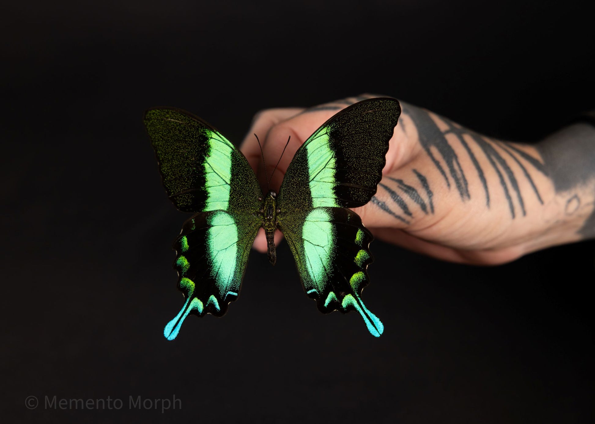 Papilio Blumei, one of the most dazzling swallowtail butterflies in the world. Its wings shimmer with brilliant bands of iridescent green and blue set against a velvety black background, creating a stunning jewel-like effect. Highly prized by collectors, this species is a true treasure of the swallowtail family.
