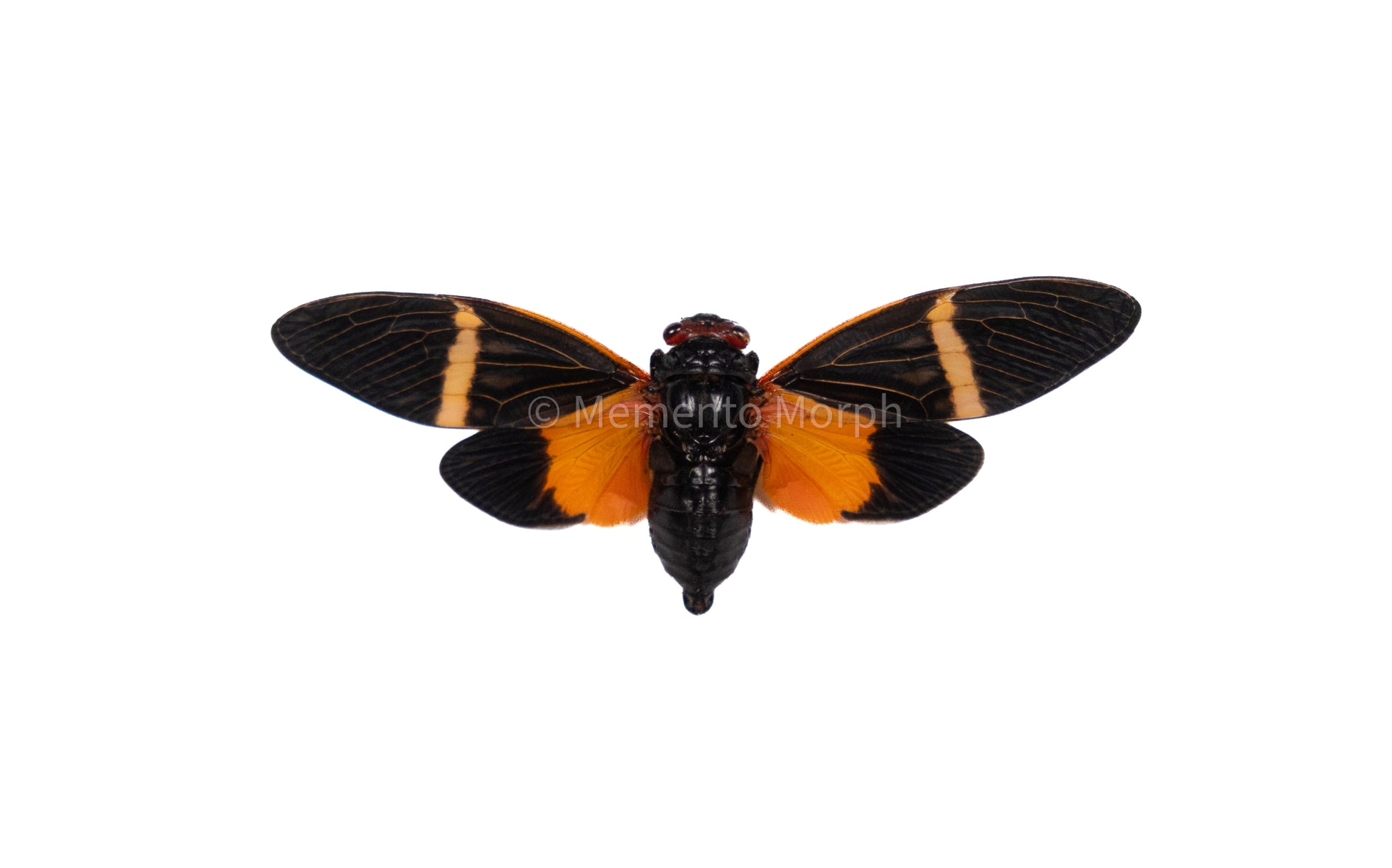 Tosena Paviei, a beautifully patterned cicada admired for its deep black body with black wings contrasted by vivid orange bands. Native to Southeast Asia, this striking species from the Cicadidae family is a favorite among collectors for its bold coloration and elegant form.